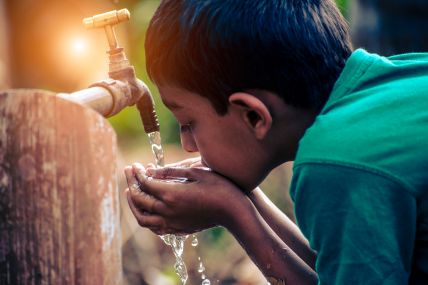 "Un niño bebe agua potable directamente de una pileta pública, símbolo del acceso seguro y continuo que se logra gracias al pago responsable del servicio por parte de la comunidad."